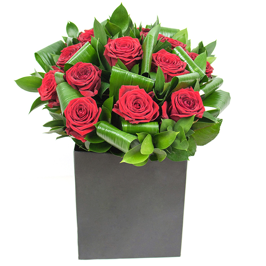 A simple and yet very stylish combination of red roses, aspidistra leaves and ruscus. It will bring style and elegance to anyone's home!